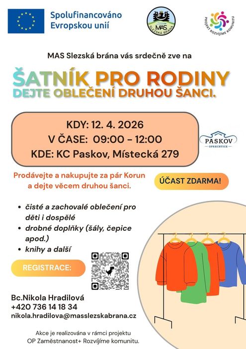 V neděli 12. dubna 2026 od hodin 9 hodin Vás MAS Slezská brána srdečně zve na Šatník pro rodiny, dejte oblečení druhou šanci.